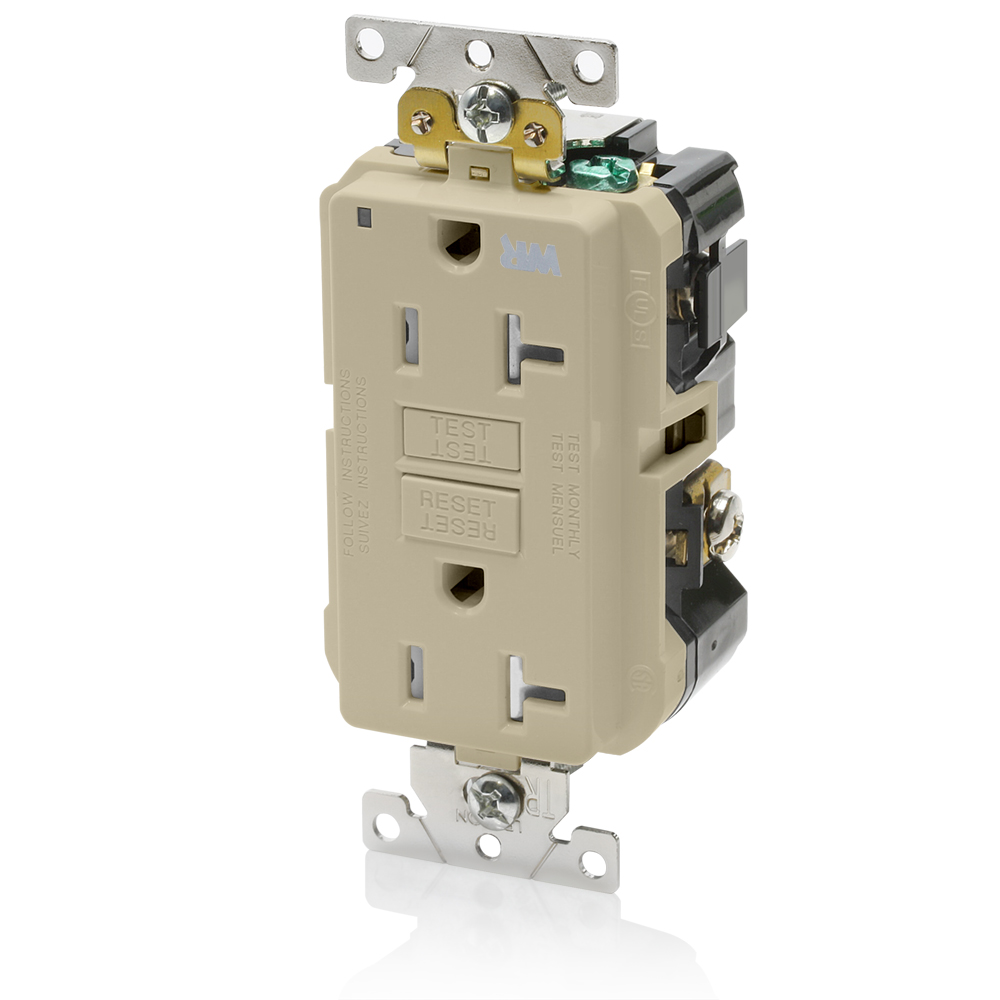 20 Amp, 125 Volt, SmartlockPro Self-Test GFCI Duplex Receptacle , NEMA 5-20R, 2P, 3W, Extra-Heavy Duty Industrial Grade, Weather & Tamper-Resistant, 20A Feed-Through, Back or Side Wired - IVORY